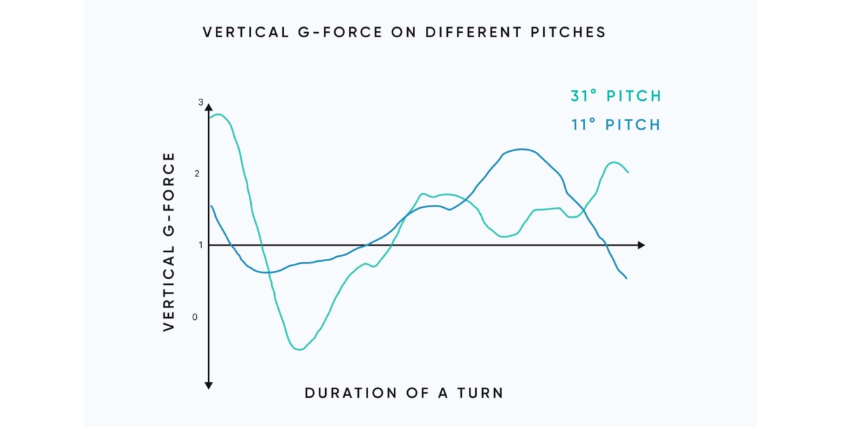 Carv’s data on skiers across different slopes confirms this — showing exactly why carving on reds and blacks too soon can be a challenge. Below is a graph showing vertical G-force data from an advanced skier on two different pitches. On the steeper terrain, the peaks and troughs of the G-force readings are much more pronounced, indicating significantly higher forces at play.
