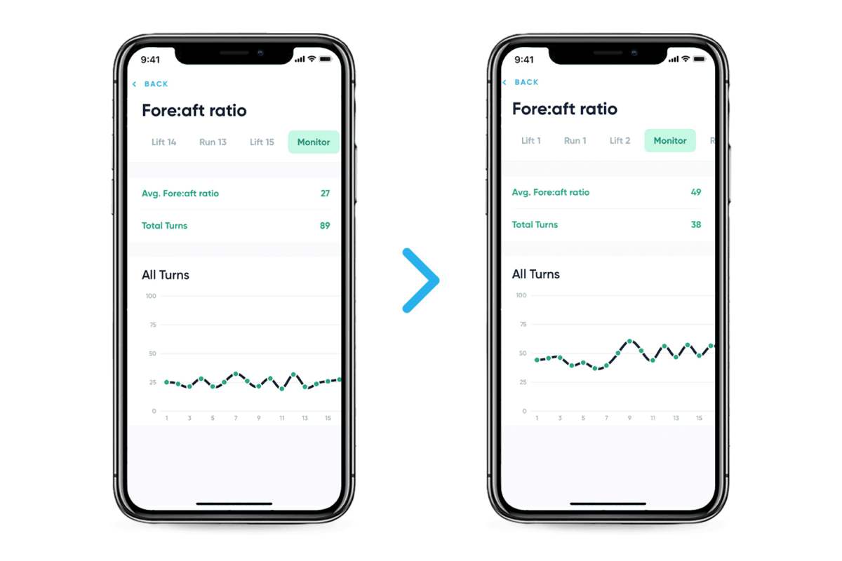 I used free-ski mode initially (getting feedback at the end of each run) and this helped me improve my Ski:IQ™ to a certain point. Carv feedback indicated I needed to work on my fore-aft ratio to make further improvements, so I focussed on this using the fore-aft monitor which gave me turn by turn feedback.