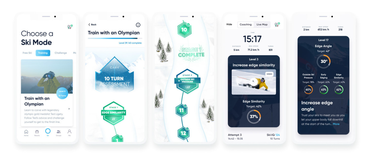Train with an Olympian guides you through 40 levels, styled in the app as a ski run. To pass each level, reach the metric targets on 10 turns in a row.