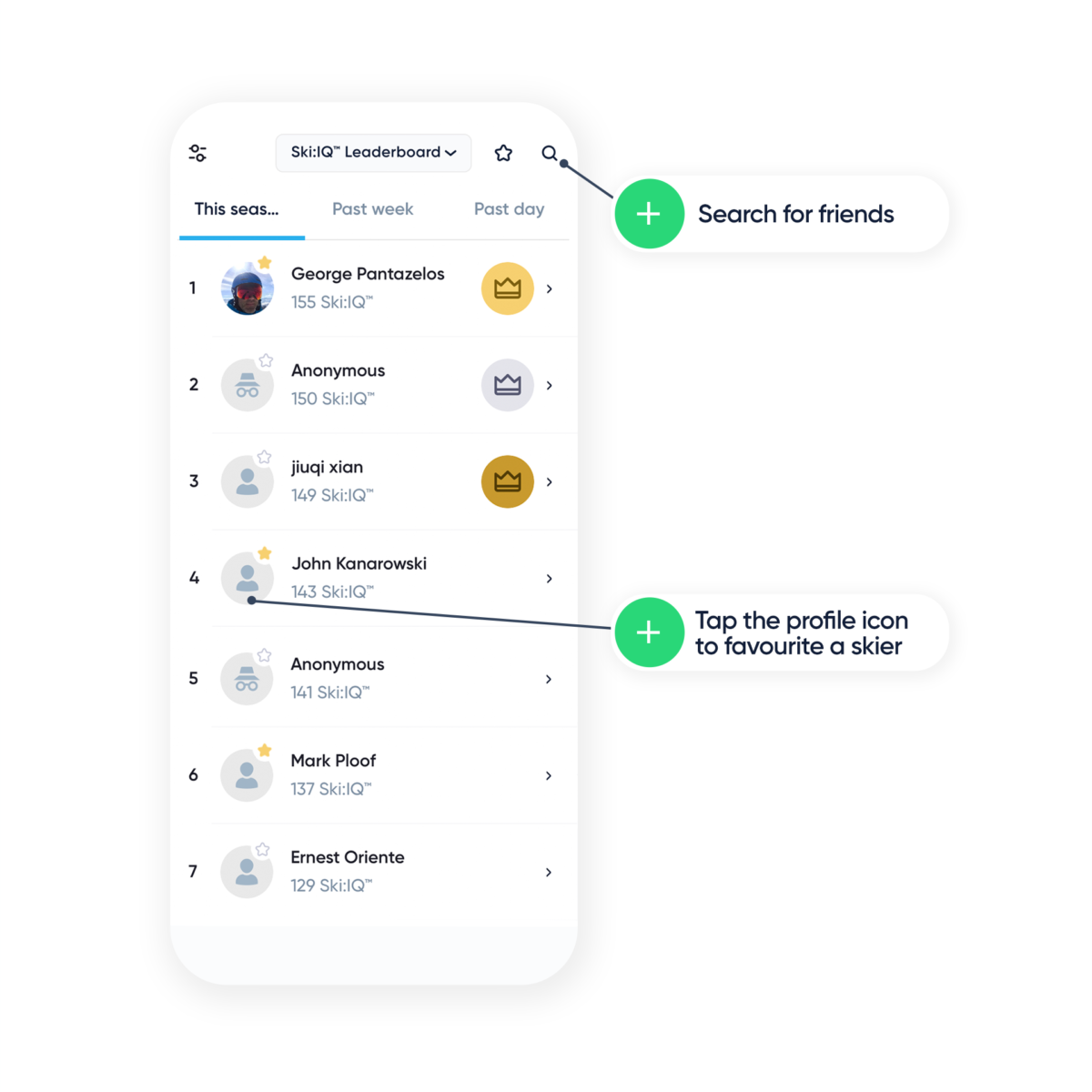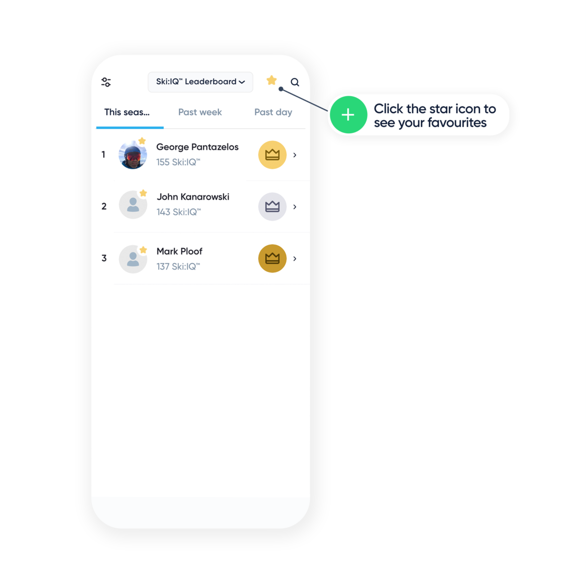 You can view your favourites list at any time by clicking the star in the top right of the leaderboard screen. Favourites works with the normal filters we introduced this year, so you can overlay run/mountain/country filters to your favourites.