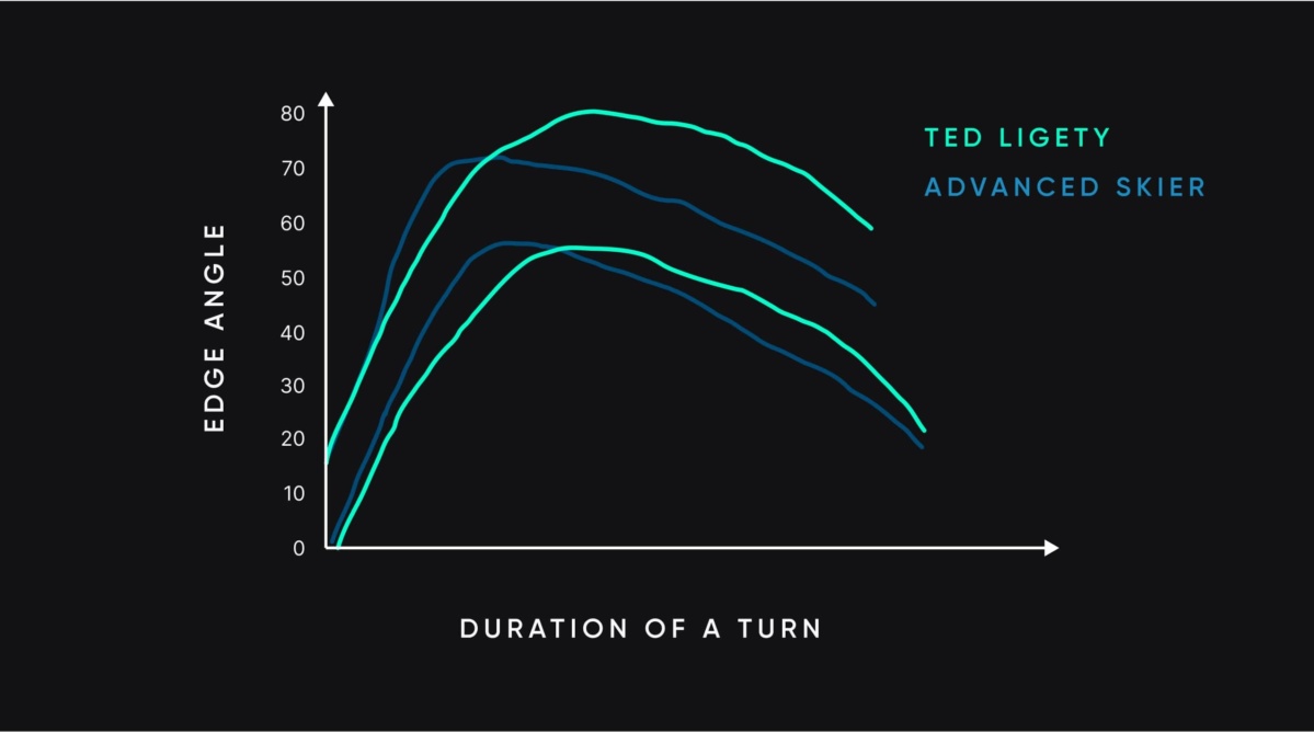 When we compare his edging data to other expert skiers, the difference is striking. He doesn’t just build edge angles quickly - he sustains them far longer through the mid-turn phase. Take a look at the graph below.