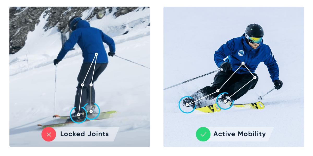 If you ski with rigid joints which are locked in place, it quickly becomes difficult to maintain a stable balance, absorb changes in terrain, and, ultimately, ski with flow. A smooth skier, in comparison, is flexible and lets their ankles, knees and hips work actively together.