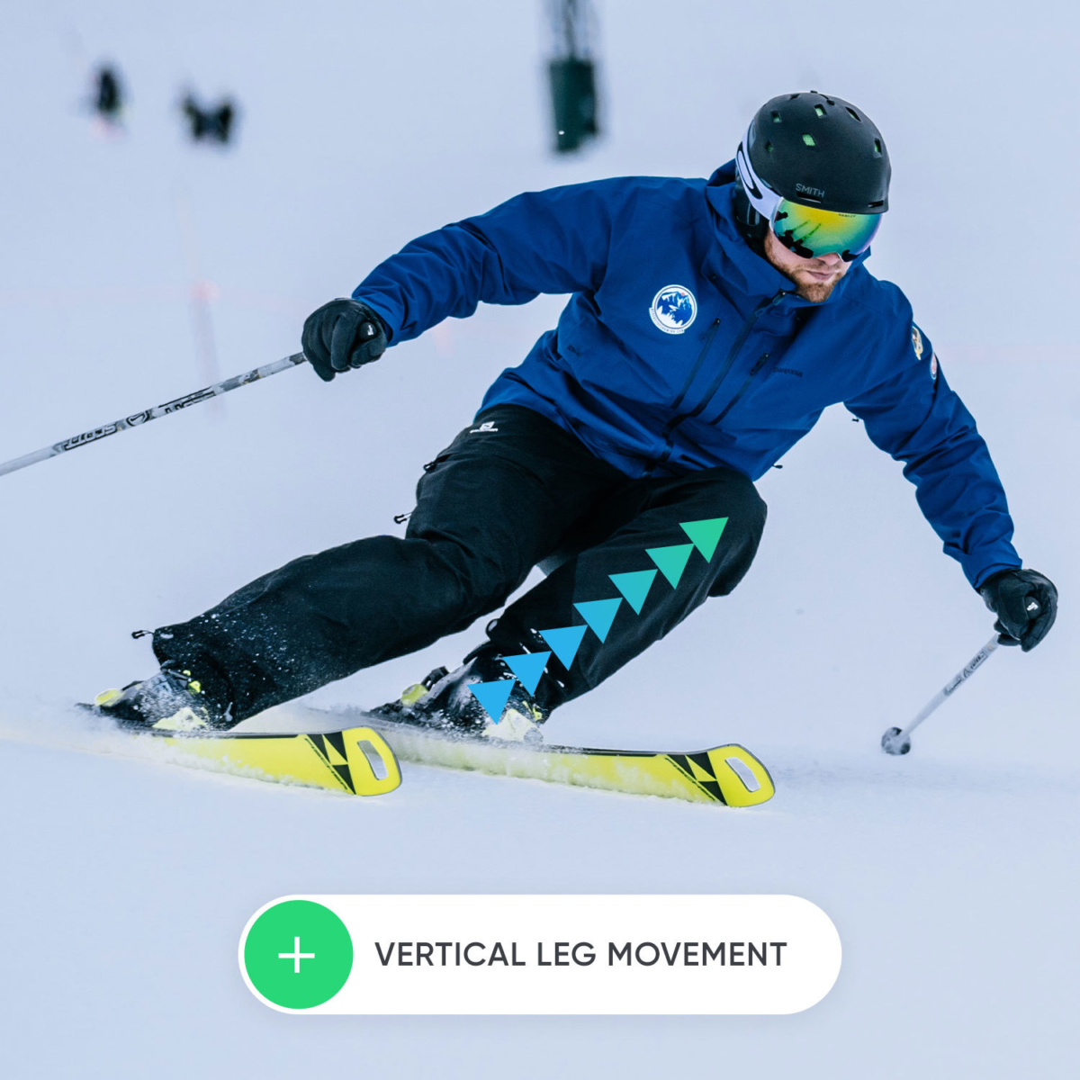 The key to this tip is focusing on how you move your inside leg out of the way. It can feel easier to use a lateral movement to move your inside ski away from your outside ski. But when we’re skiing (particularly advanced skiers), our body is leaning at an angle, so a lateral movement would push our inside ski into the snow. Instead, we want to focus on an active vertical movement, so lifting your inside ski up out of the way.