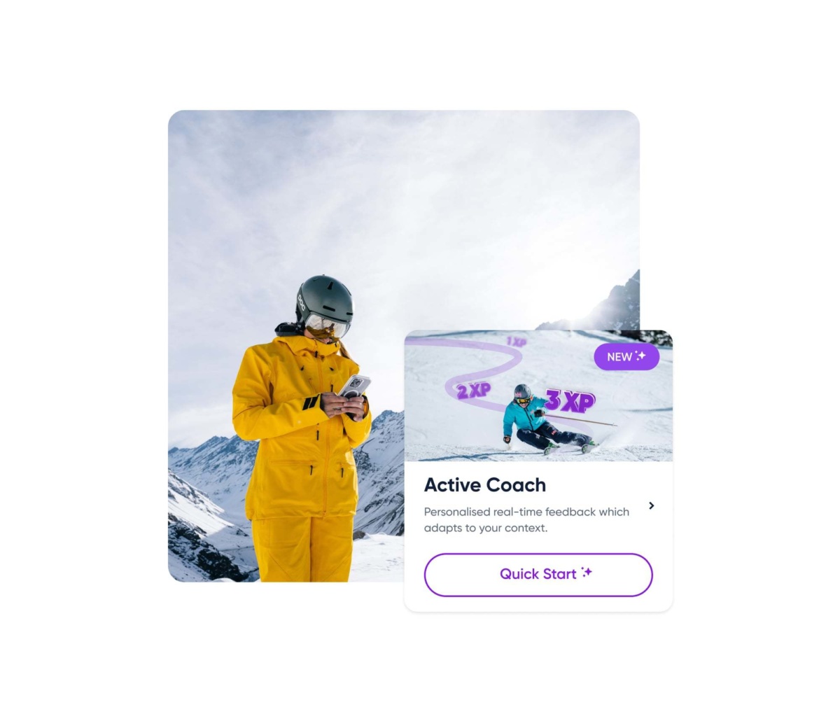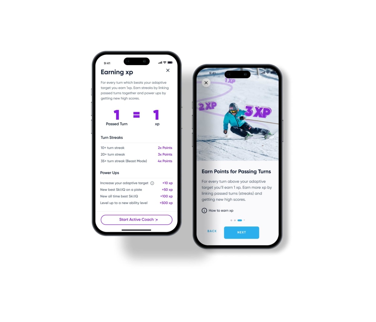 Designed to adapt to both your abilities and varied slope conditions, Active Coach ensures you make the most of every run. We built it to select the right focus area for your recent skiing and help you stay in that flow zone with dynamic leveling, pings, streaks, and the XP system.