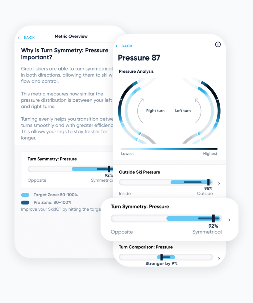 - Turn Symmetry: Pressure (shown here) is a measure of your pressure distribution between your left and right turns.