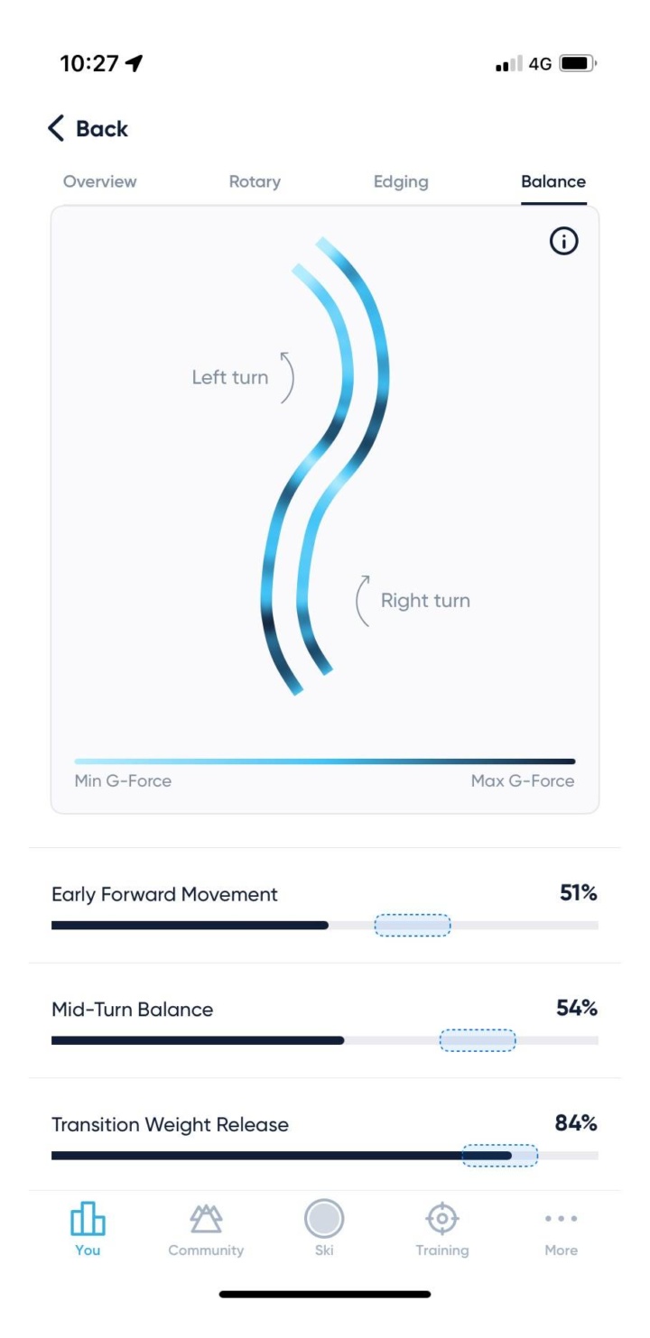 Carv breaks down your performance across 10 key metrics in Rotary, Balance, and Edging, giving you detailed insights into every aspect of your skiing.