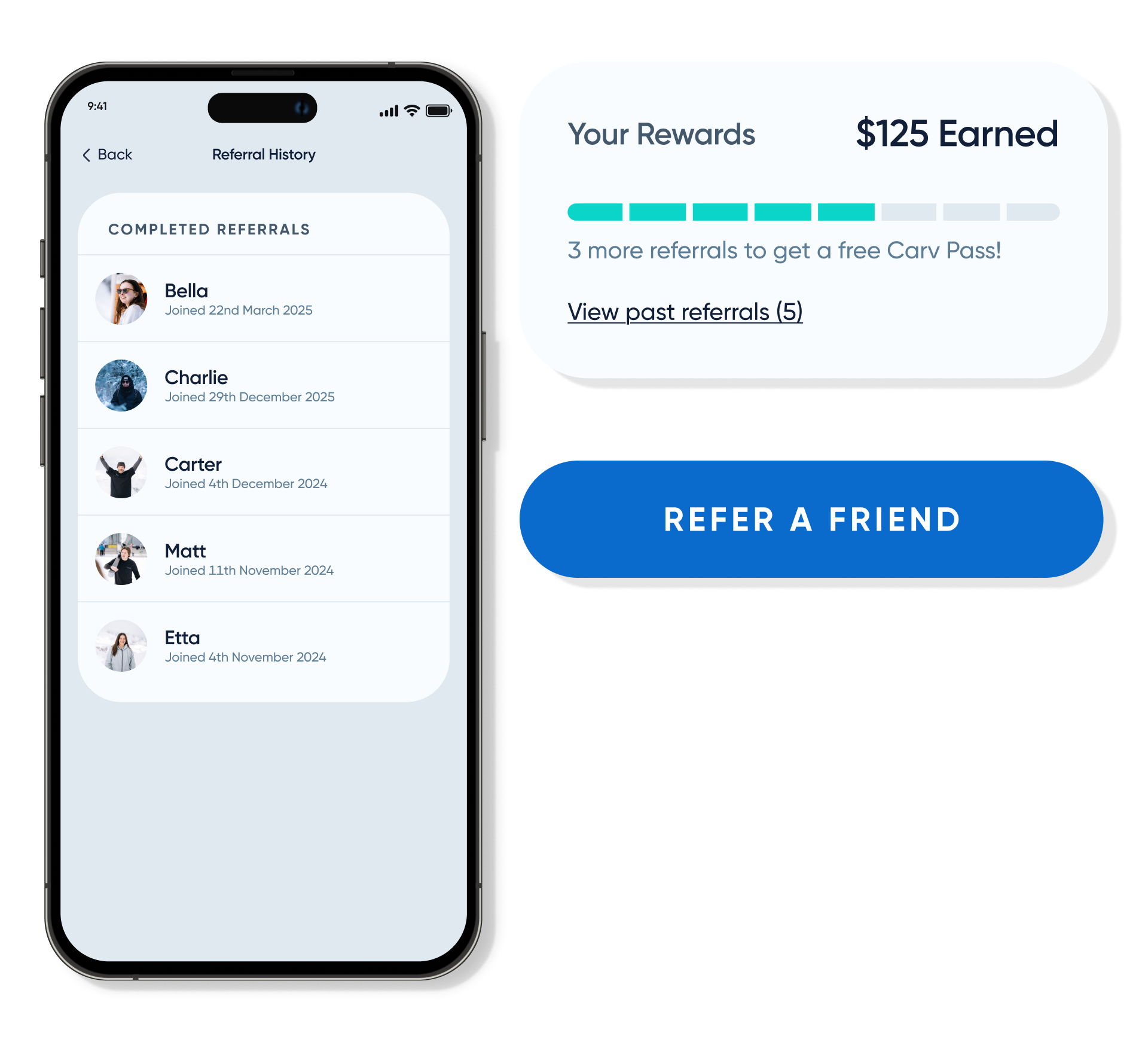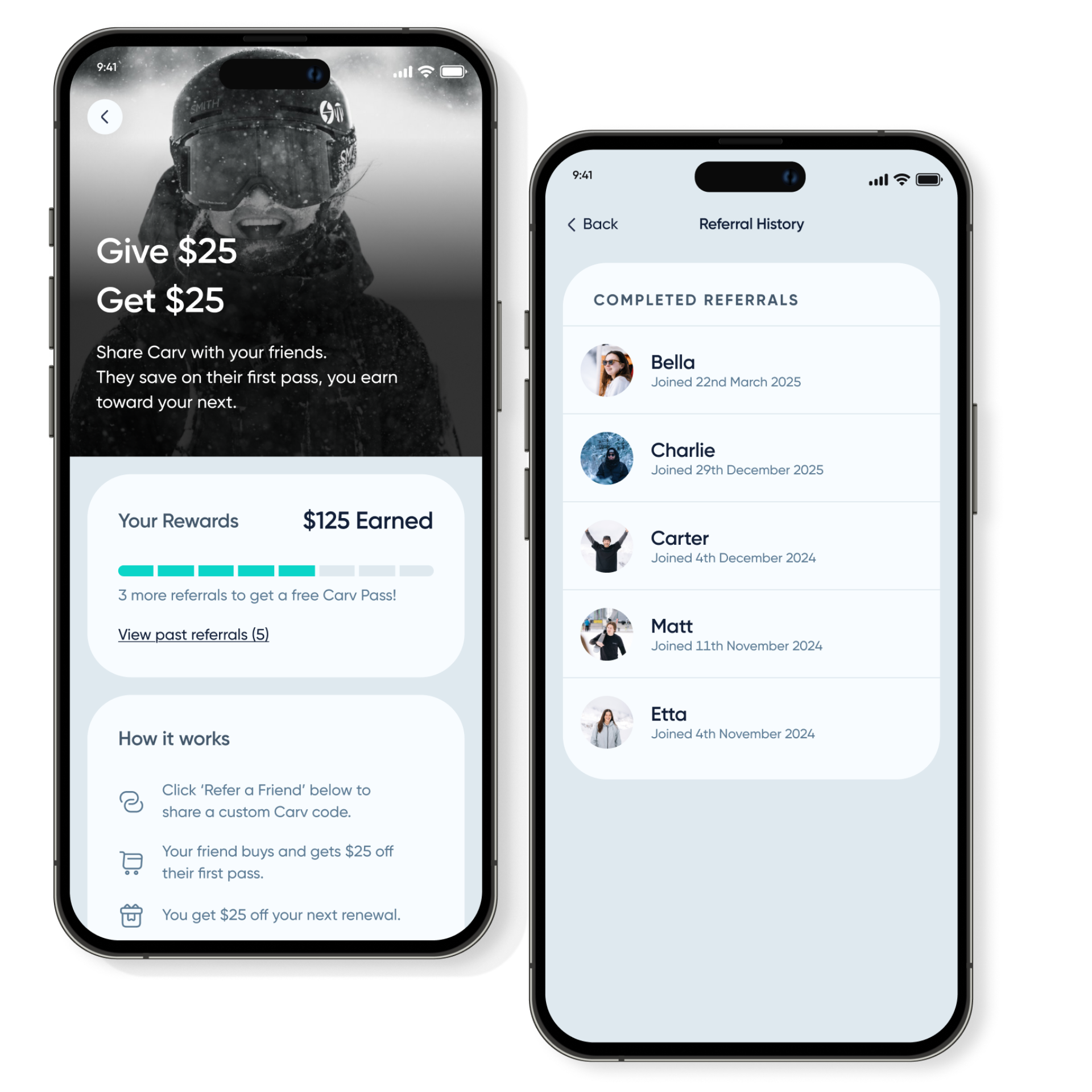 That’s why we’ve revamped our referral program to make it more rewarding. Invite your friends to Carv and unlock exclusive benefits. They save on their pass and you earn credit toward your next season. Stack your referrals and you could ski Carv free.