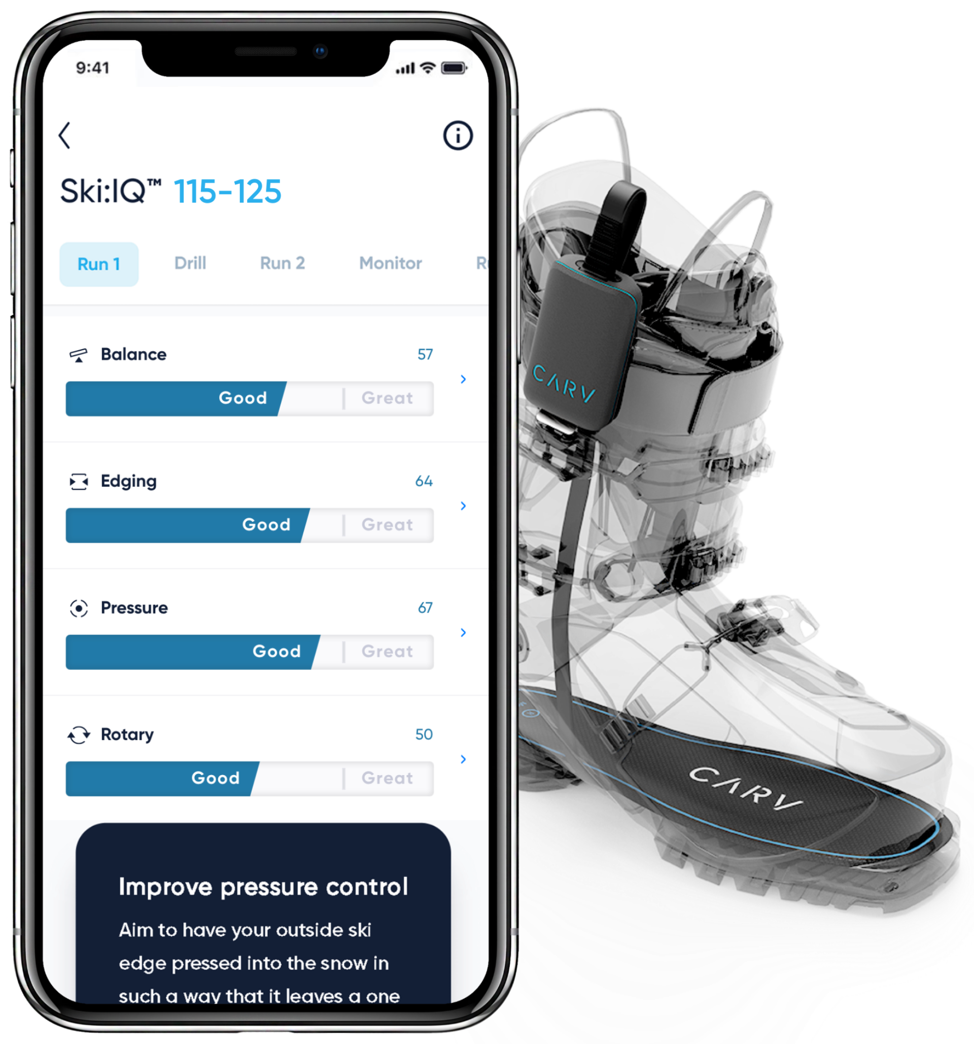 We've developed Ski:IQ™ as a quantified score of your skiing technique. While we can only estimate your Ski:IQ™ based on the quiz, with Carv in your ski boots you'll be able to track your progress against 4 fundamental skiing skills: Balance, Edging, Rotation, and Pressure.