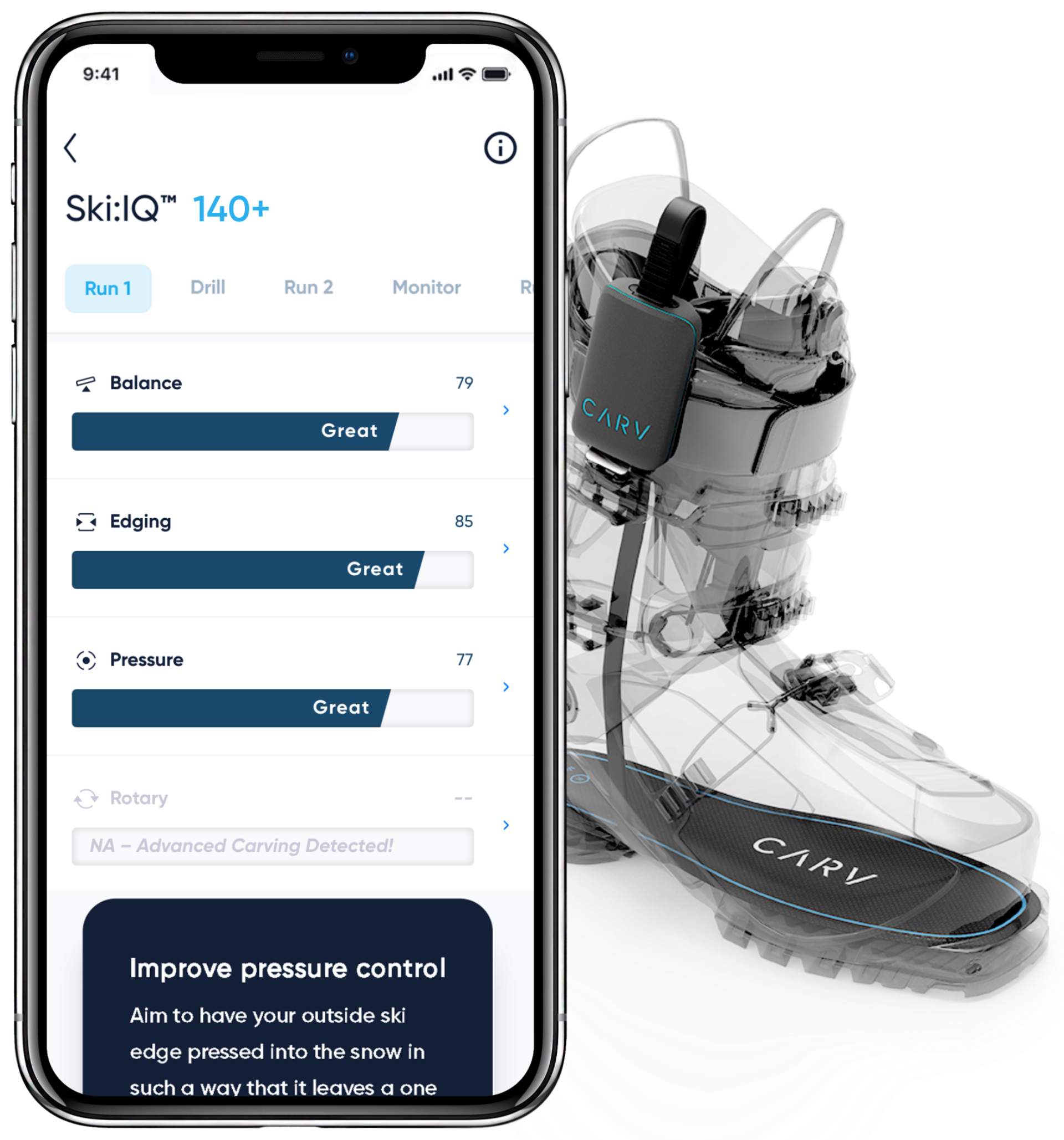 Carv's technique analysis is very accurate at revealing biases in your technique which you're either used to or are too subtle to see. The real-time pressure and motion sensors look for differences in edging and pressure when you turn left or right to discover your weaker side.