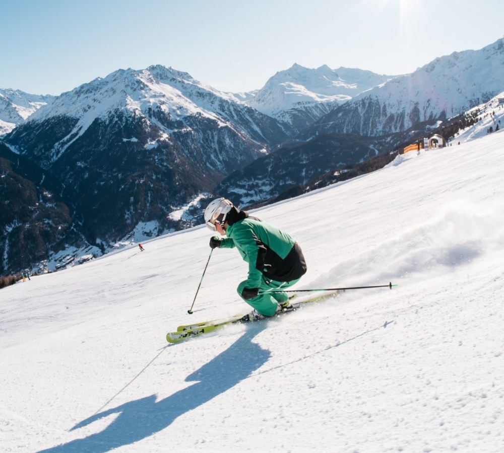 Through your turns, feel a gentle pressure between your shins and the tongue of your ski boots, and centre your weight over your toes, while keeping your knees slightly bent.