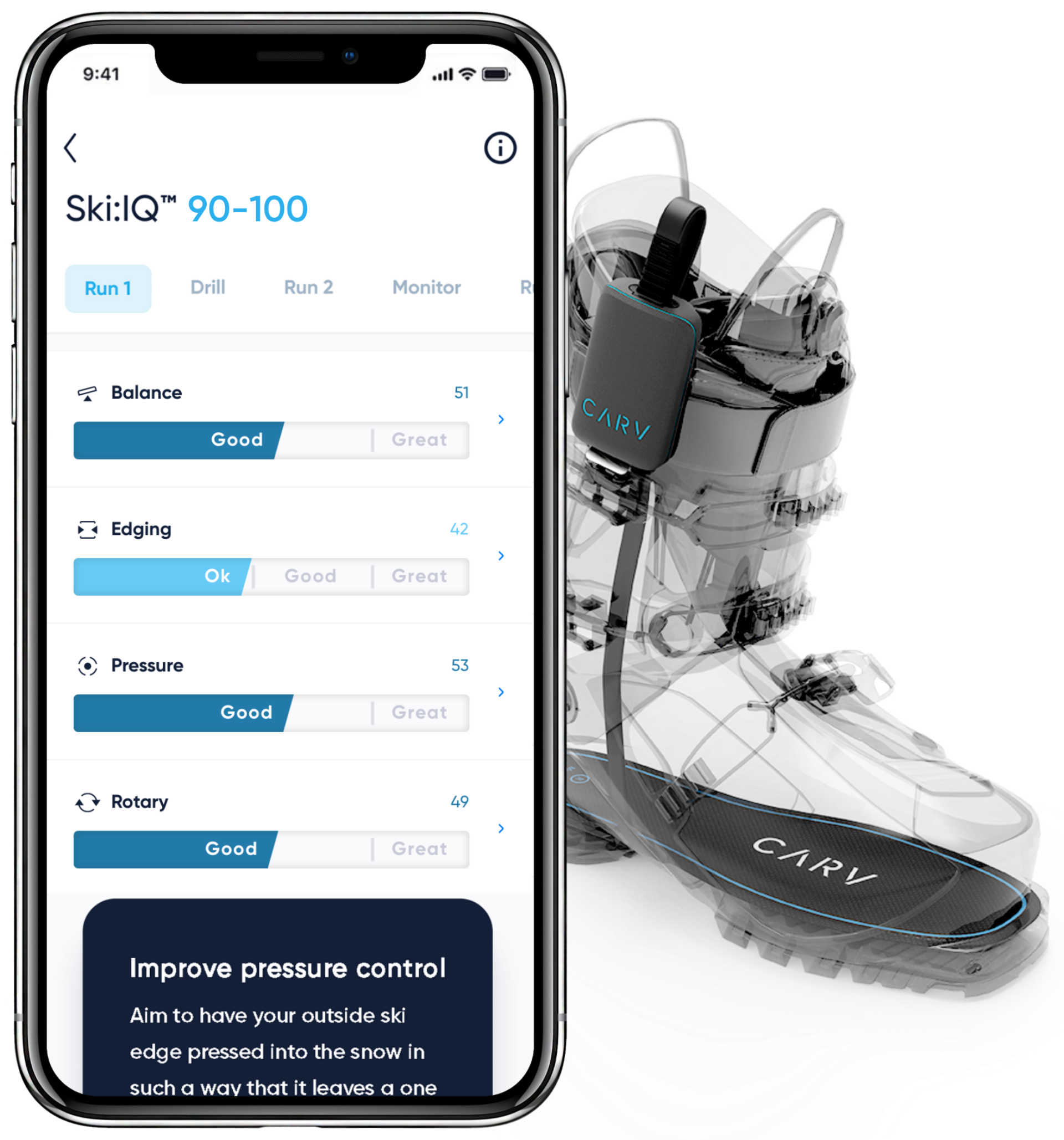 Focus on gradually building pressure on the outside ski right at the start of the turn, and your Carv pressure score will improve.